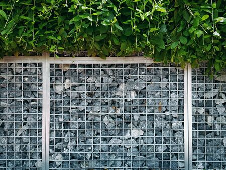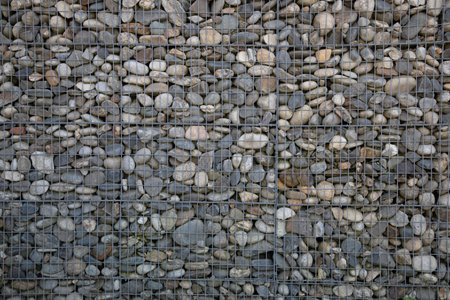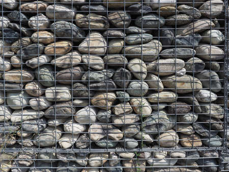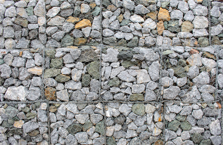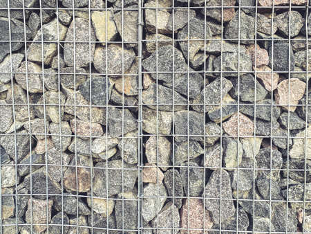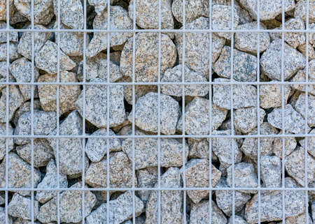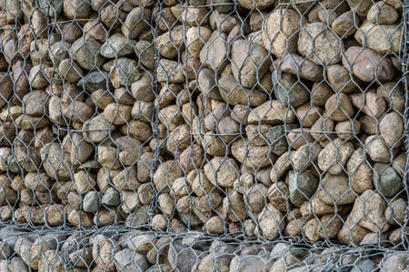 Gabion grated stone wall by pebbles in iron cage of rock horizontal stones box filled with rocks background