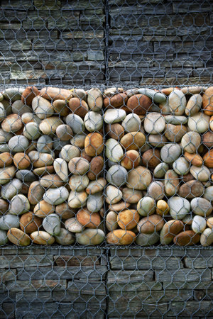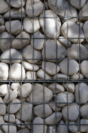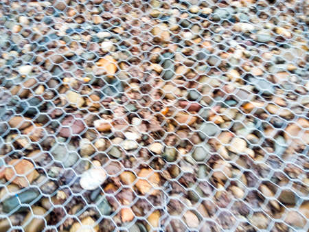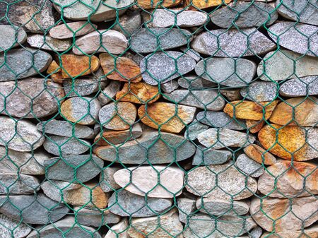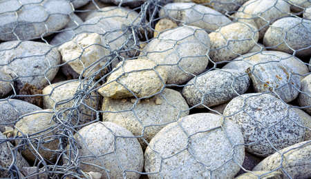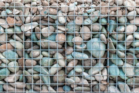 Gray white and blue round stones in metal mesh background. Natural environmental material fencing