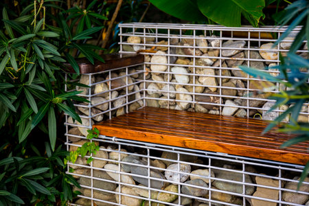 A wall made of gabions, next to it a bench and a garbage can. Garden architecture.
