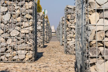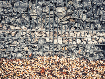 Detail of a low gabion wall. The texture of the gabion fence is made of natural stone and metal mesh