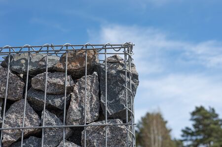 Galvanized gabion box filled with rocks. Nature park architecture landscaping