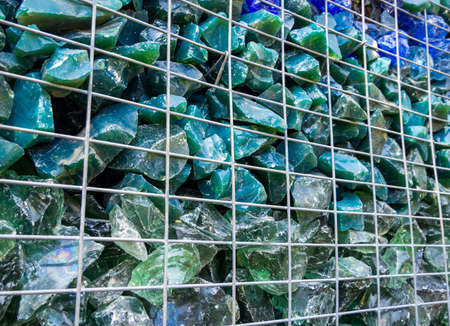 texture of gray metal grate and green pieces of glass in the wall of the fence on the street