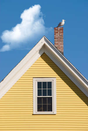 Yellow gable with chimney seagull and blue sky