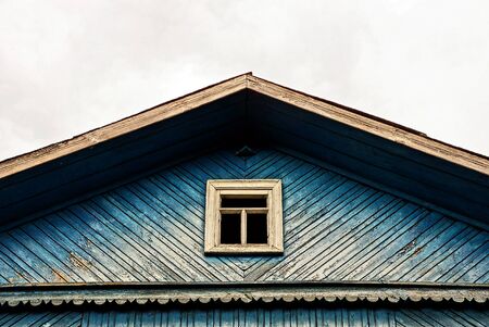 Blue wooden house with white window on blue sky background, close up