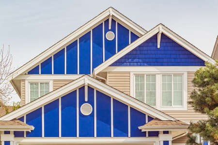 Panorama frame Exterior of upper storey of townhomes with blue sky background on a sunny day. The townhouses have pitched roofs, square windows, and blue and cream wall.