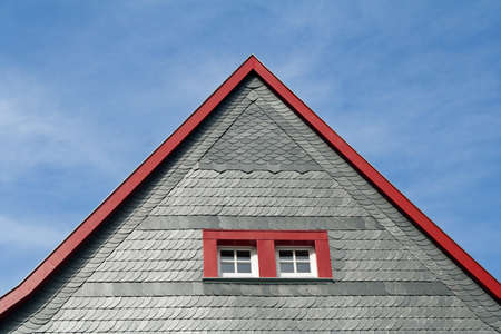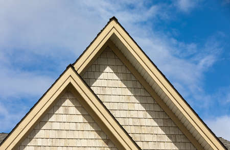 Roofline covered with shingle and pointed attic windows against blue sky. Copy space