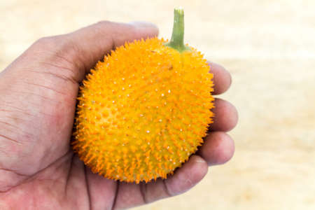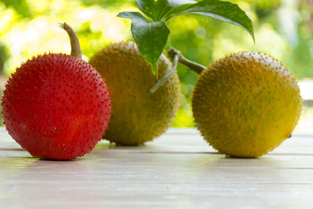 Gac fruit, Baby Jackfruit, Spiny Bitter Gourd, Sweet Grourd or Cochinchin Gourd on wooden background