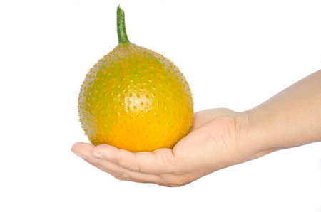Hand holds gac fruit, is isolated on a white background