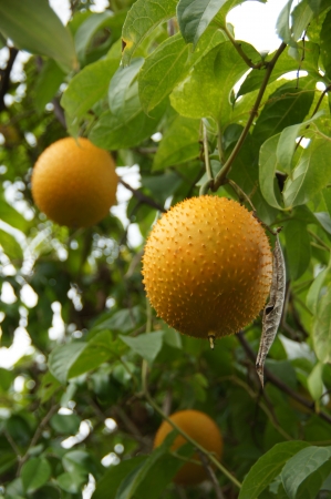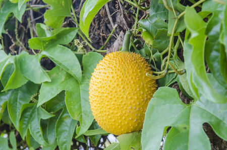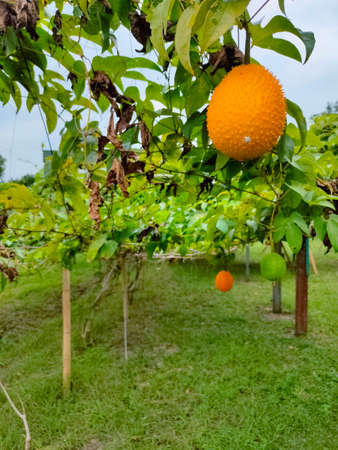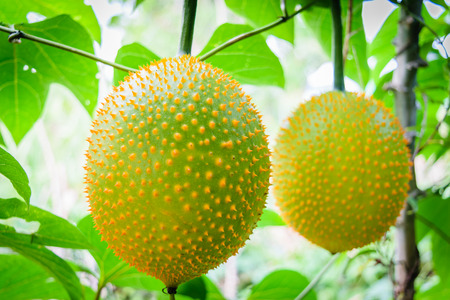 Organic yellow gac fruit (Momordica cochinchinensis) on the vine. Gac is notable for its deeply orange fruit that is rich in beta-carotene and lycopene.