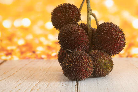A bunch of the local fruits called pulasan. Pulasan is a tropical fruit from soapberry family, similar to rambutan. Selective focus. Blurred background