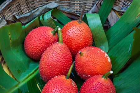Gac fruit on banana leaf in the basket.