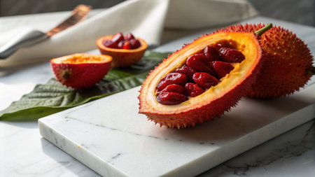 A unique tropical fruit displayed on a marble countertop, featuring spiky orange skin and juicy red berries sliced open, perfect for culinary inspiration.