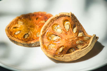 Aegle marmelos, sliced dried herbs, are used to make healthy drinks.