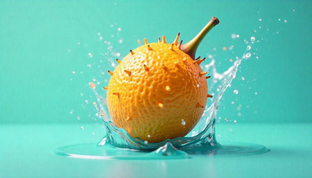 Horned melon splashing into water against turquoise background