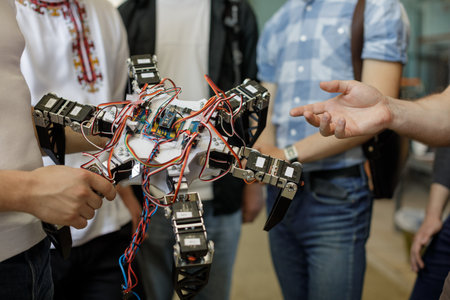 Close-up of DIY robot and microcontrollers board in robotics laboratory school.