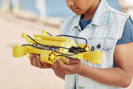 Cropped shot of young black boy holding yellow robot model, engineering for kids background