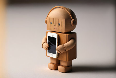 A little wooden figurine clutches a modern smartphone