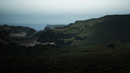 Cliffs Coast Ocean Rocky Green Hills Coastline with Crashing Waves in Misty Weather