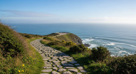 AI Generated. Coastal Path Along Rocky Cliffs Overlooking a Cove and the Sea