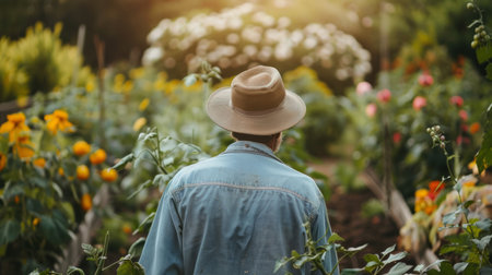 A man in a hat is watering in a garden. Generative AI image.
