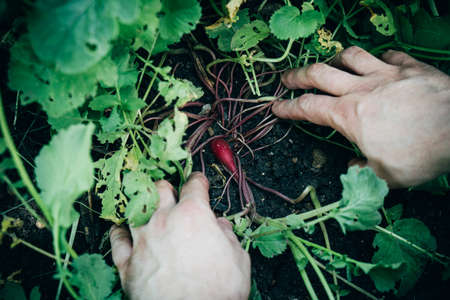 Mans hands and radish in soil, growing vegetables in the garden