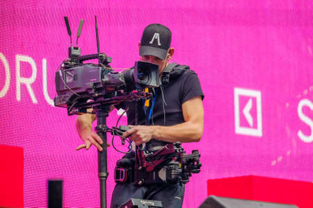 Saint Petersburg, Russia - October 4, 2019: Steadicam camera man online broadcasting from stage