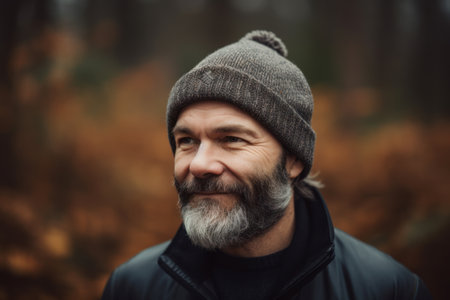 Portrait of a bearded man with gray beard in the autumn forest
