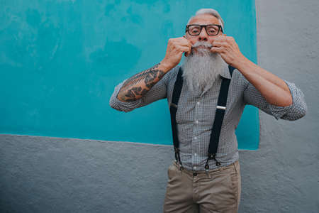 Cool Senior hipster man with stylish beard. Modern business man urban portraits outdoor. Conceptual representation of aging as a state of mind