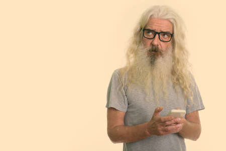 Studio shot of senior bearded man thinking while holding mobile phone