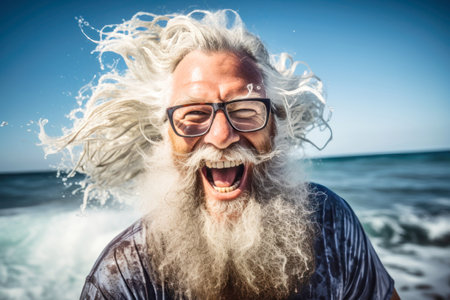 An elderly man with a beard swims in the sea waves. Close-up portrait. Happy emotions. Active lifestyle. Relaxation on the beach