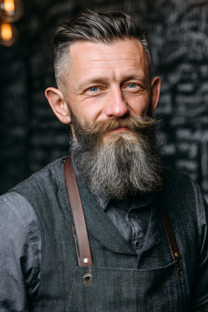 A mature man with a distinguished beard poses thoughtfully against a dark background, exuding confidence and wisdom. His calm expression captures the essence of experience and depth.