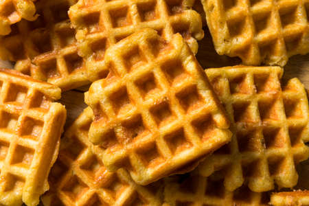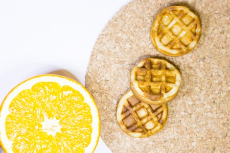 two carrot waffles sprinkled with powdered sugar on a wooden board. Homemade waffles on a wooden board