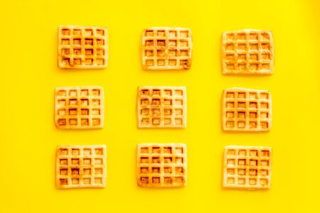 Breakfast waffles on a brown wooden background. Homemade cake. Copy of the space.Flat layout.Top view.