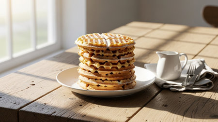 A cinematic ultrawide shot (16:9) capturing a stack of fresh, heart-shaped waffles on a large rustic