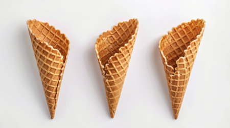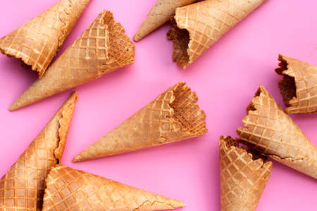 Three empty waffle horns on a concrete background. Top view, creative background, minimalist trend