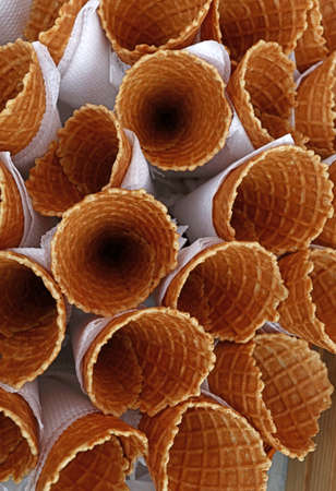 Several empty fresh wafer ice cream cone cornet cups with white paper napkins, close up, elevated high angle top view, directly above