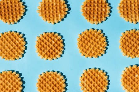 Three types of waffles on a blue background. Round waffles, filled waffles and long wafer rolls.