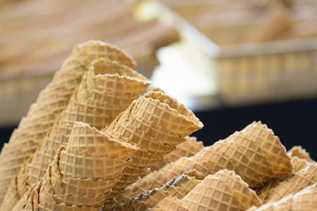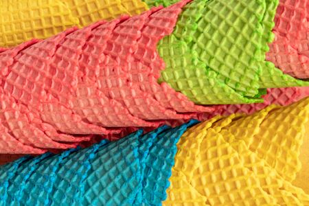 Many colorful crispy waffer tubes, cones for icecream close up.