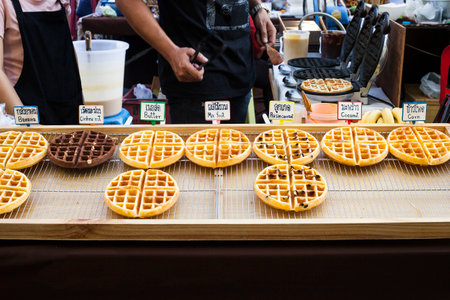 An AI generated illustration of A street vendor is hard at work preparing delicious waffles for customers to purchase at the market