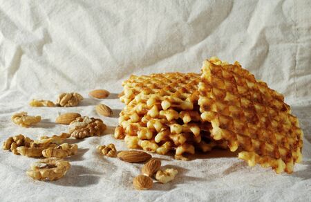 Viennese waffles and walnuts on a white tablecloth, taken with harsh light.