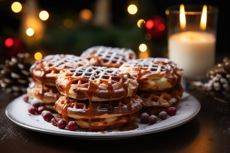 Delicious homemade waffles lined with bright red berries await a tasty moment.