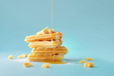 Waffles with syrup on white background, top view. Breakfast and food concept