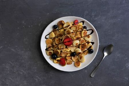tiny pancakes on a flat plate watered with chocolate, pancake porridge for breakfast, flat lay, small pancakes with blueberries and strawberries
