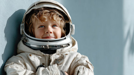 A cheerful child wearing an astronaut helmet smiles while leaning against a blue wall, embodying dreams of exploration and cosmic adventures.