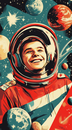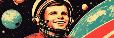 A proud, retro-styled poster featuring an astronaut smiling with a backdrop of stars and planets honoring the first human in space on Cosmonautics Day, banner