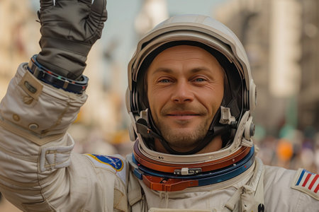A moment of joy: a smiling space explorer in a moment of greeting filled with flight and joy