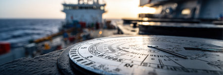 A ships navigator relies on a compass to determine direction as the sun sets on the horizon, casting a warm glow on the ocean waves.