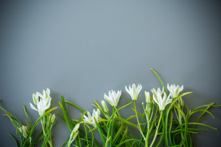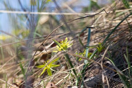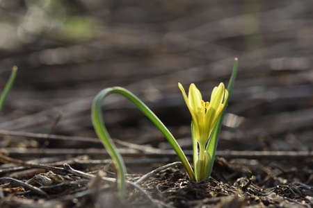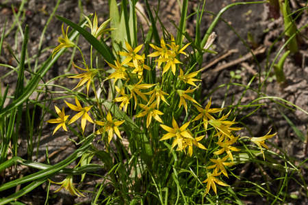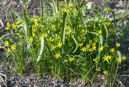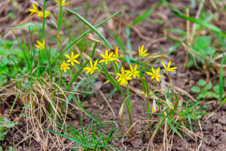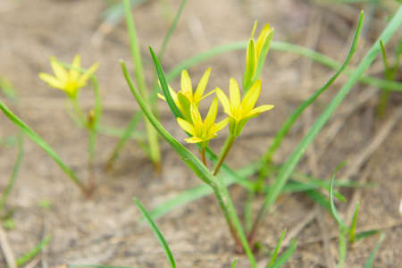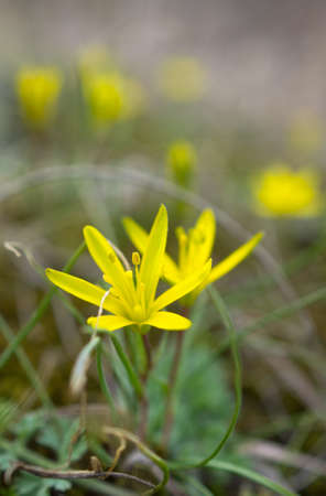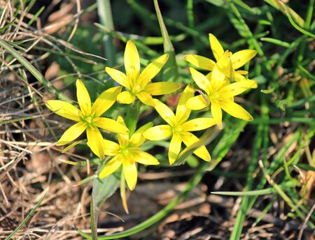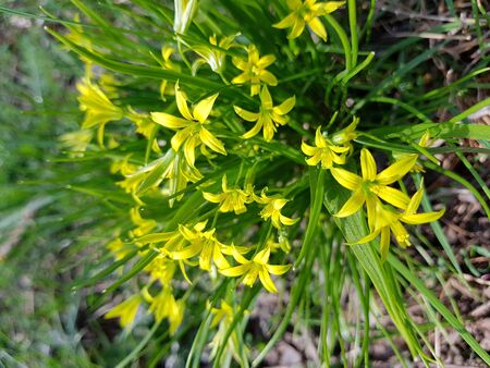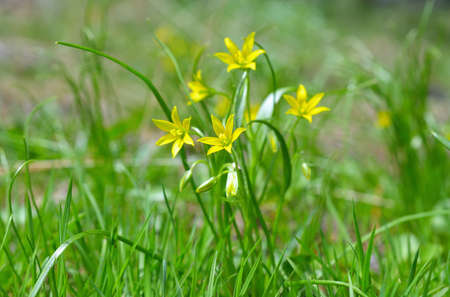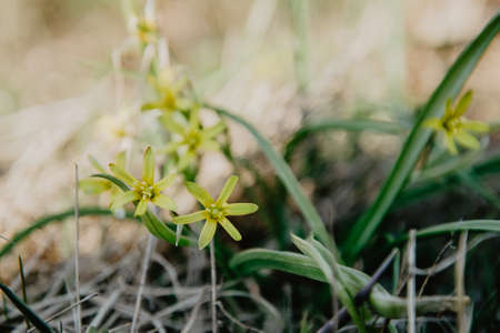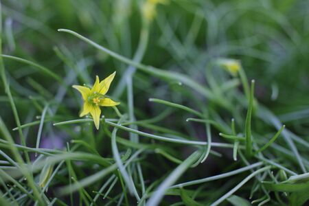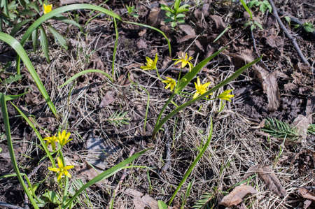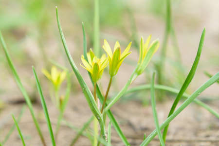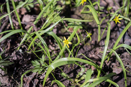 Early spring little flowers Yellow star of Bethlehem (Gagea lutea) with the leaves look like grass. Natural background.