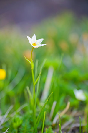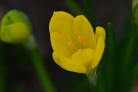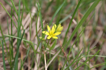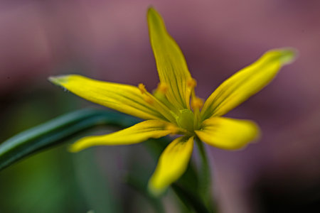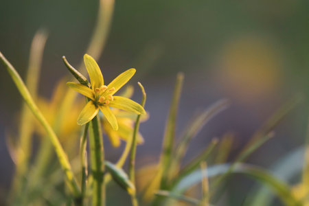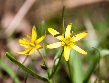 Blooming Yellow Star-of-Bethlehem, Gagea lutea, closeup, selective focus, shallow DOF