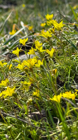 Goose onions flowers. Yellow snowdrop and Gagea lutea. Spring and summer preparation concept. Ecological and horticulture. Close-up. Green grass and selective focus. Wild plants. Vertical shot.